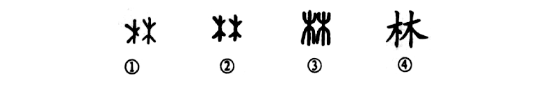 “羈鳥(niǎo)戀舊林,池魚(yú)思故淵。”這個(gè)“林”字是個(gè)同體會(huì )意字。甲骨文①就像并立的兩棵樹(shù)。金文②的形體同于甲骨文,小篆③也是從甲、金文字演變而來(lái)的,只是把直筆變成曲筆而已??瑫?shū)④則又把小篆的曲筆改為直筆,這樣書(shū)寫(xiě)方便。