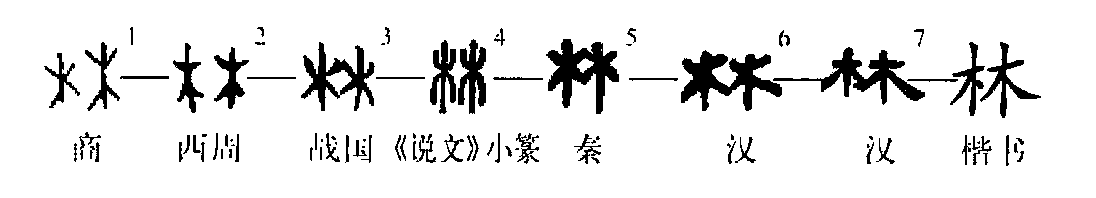 會(huì )意字。從二木,表示叢聚的樹(shù)木。本義是連接成片的樹(shù)木。《說(shuō)文》:“林,平土有叢木曰林。”《詩(shī)·邶風(fēng)·擊鼓》:“于以求之?于林之下。”《詩(shī)·大雅·大明》:“殷商之旅,其會(huì )(通“旝kuài”,旌旗)如林。”比喻聚集在一起的人或事物。漢司馬遷《報任安書(shū)》:“士有此五者,然后可以托于世,而列于君子之林矣。”南朝梁蕭統《文選序》:“歷觀(guān)文囿,泛覽辭林,未嘗不心游目想,移晷忘倦。”(冀小軍)